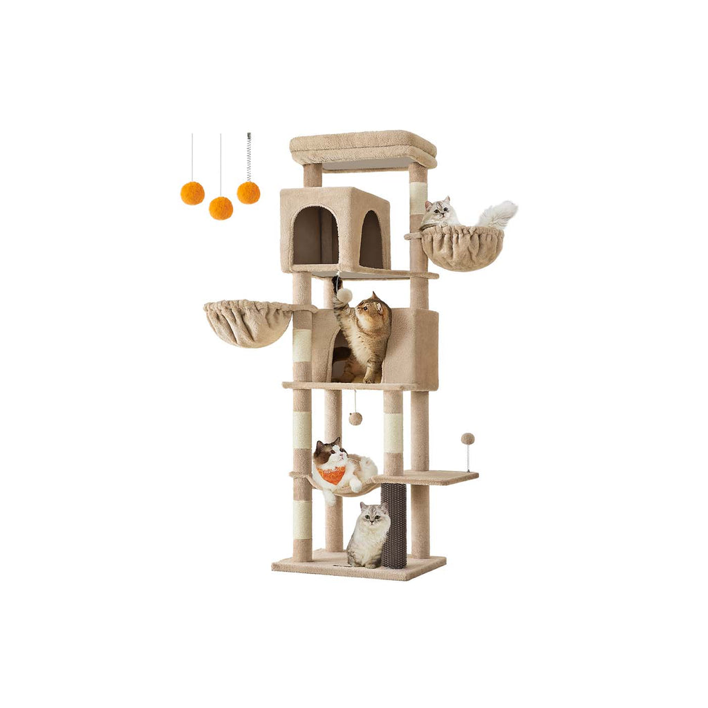Com 2 tocas aconchegantes, 2 camas suspensas, 1 rede de descanso e plataforma panorâmica, este modelo permite que os gatos observem tudo do alto, se alonguem nos postes de sisal e aproveitem momentos de puro conforto. Perfeito para gatos grandes e cheios de energia!